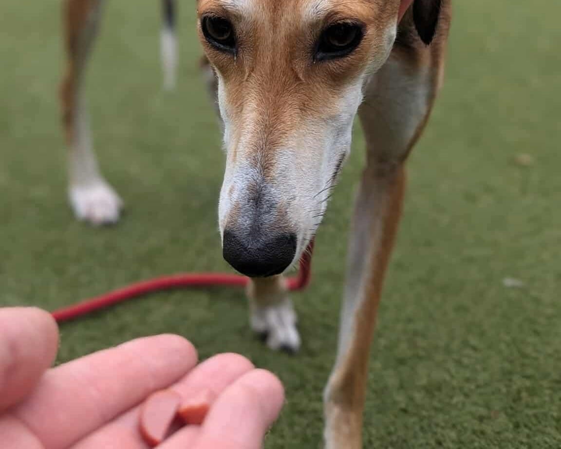 Barbie is a sweet but sensitive lurcher who spent a long time wandering as a stray before coming into our care. Because of this, she’s still learning what life with humans is all about. At the moment she’s very anxious and doesn’t quite understand affection or touch just yet, but she’s already showing us how brave she is by accepting treats and even starting to show little signs of play.